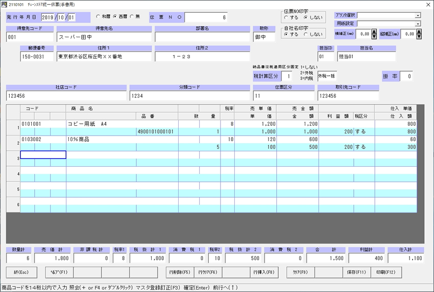 〇現在使用されている伝票印字 有料で対応いたします。 〇軽減税率に対応 (Ver3.02から コクヨ 軽減税対応伝票に対応しました) チェーンストア伝票、百貨店店伝票、送り状印刷にはドットプリンタが必要です。 |