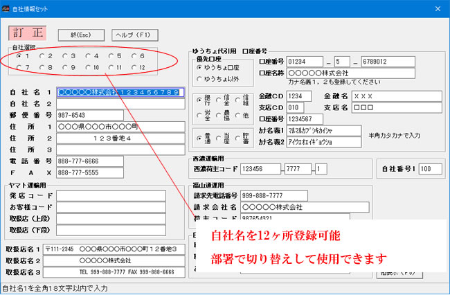 ○自社名を12ヵ所登録可能(部署別に印刷、経費管理)