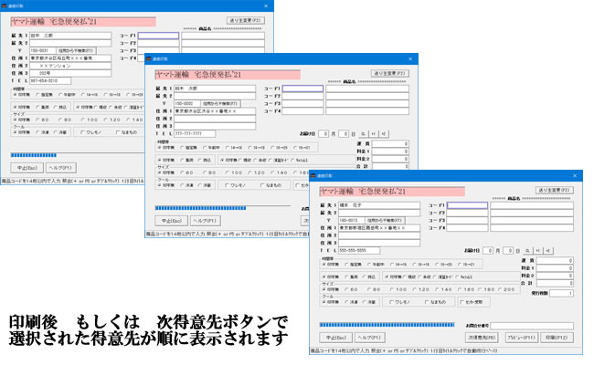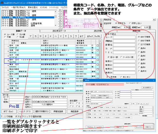 以外は印字できません。 ○データベース組込 届け先、依頼人の名称、住所、電話番号などは、事前に登録し、 印刷時に呼出できます。