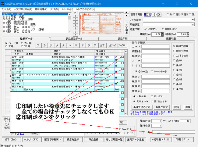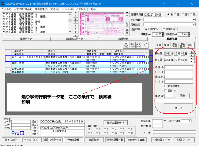 得意先様指定で 昨年の届先を抽出し印刷できます。