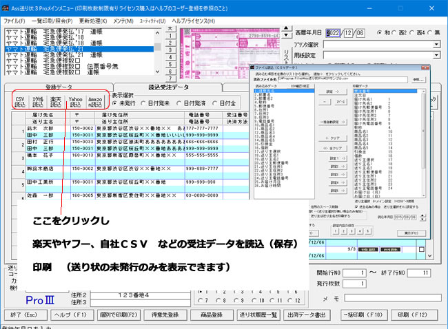 ○楽天の送り状、受注データ(CSV)に対応 読込後印刷できます。