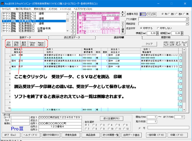 また、CSVファイルやエクセルデータからも読込印刷、CSV書出(他社送り状発行システムで使用できます)