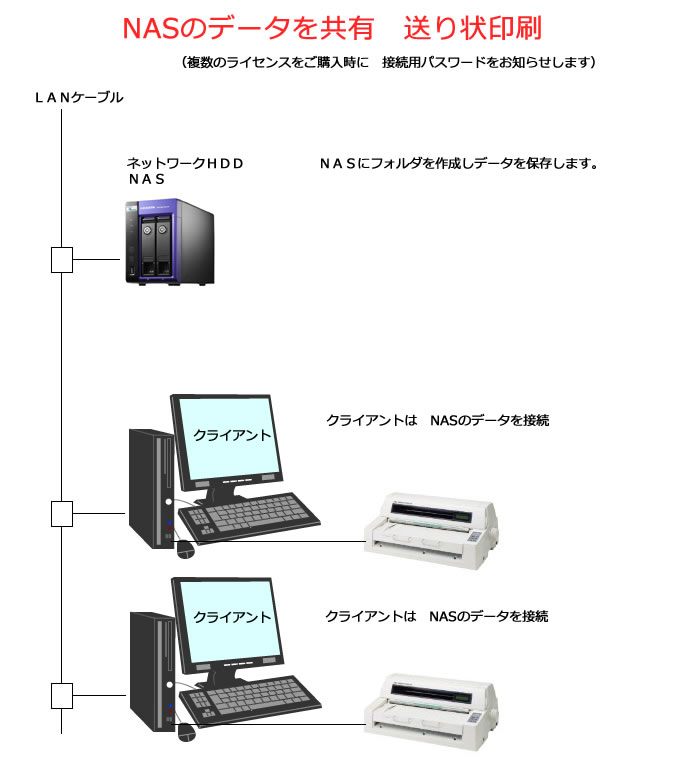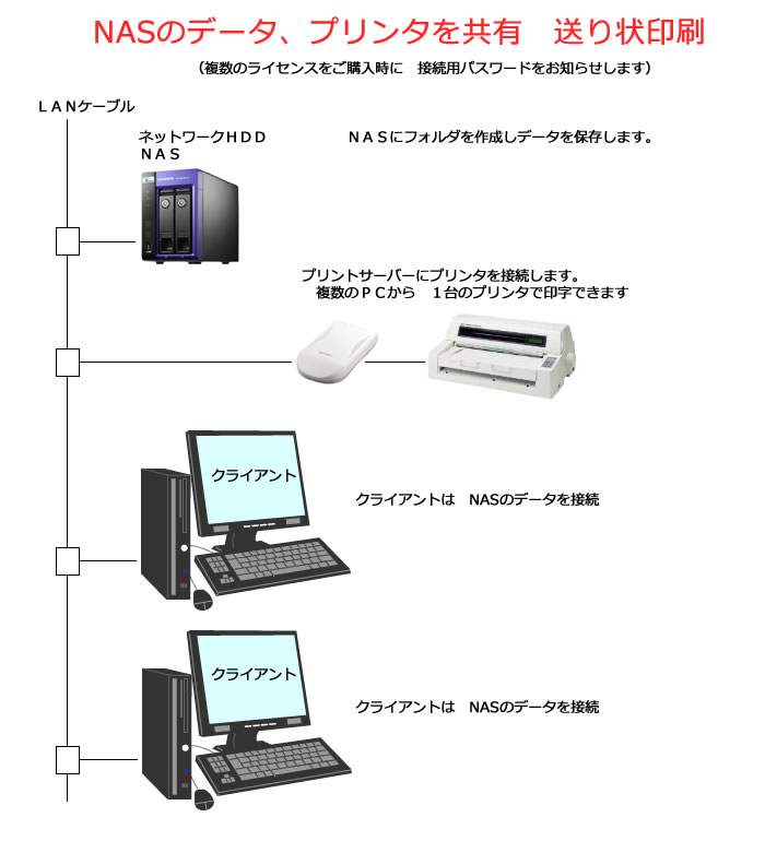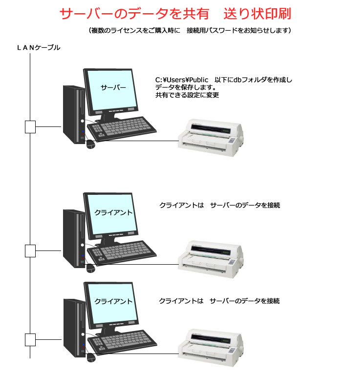 データをサーバーなどに置くことで、 複数のパソコンで同じデータを共有できます。 得意先や商品を登録し 各パソコンで使用できます。 プリンタも共有可能です。送り状を専用にプリンタを1台セットしておけば、プリンタを切り替えして印刷できます。