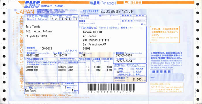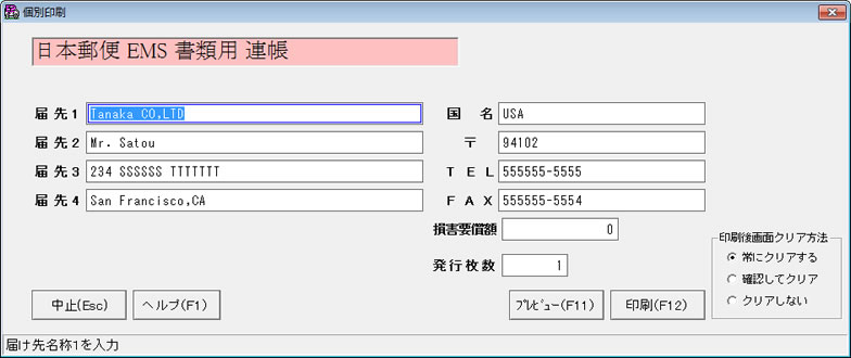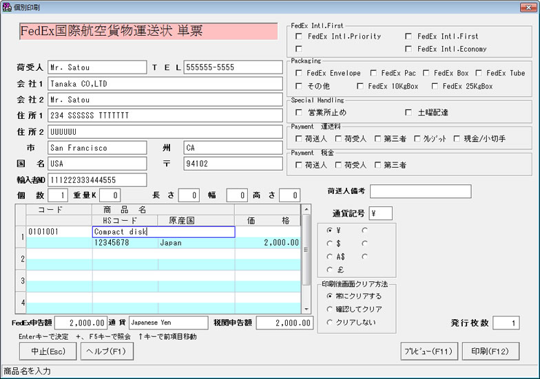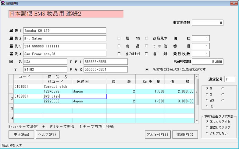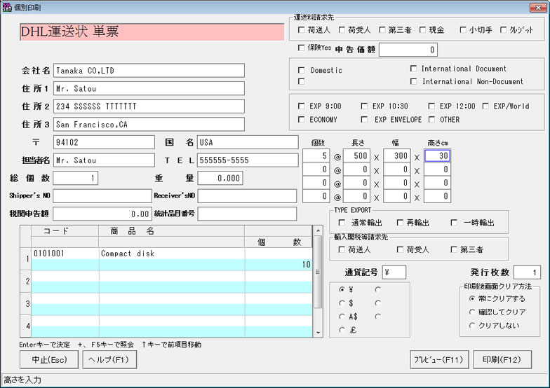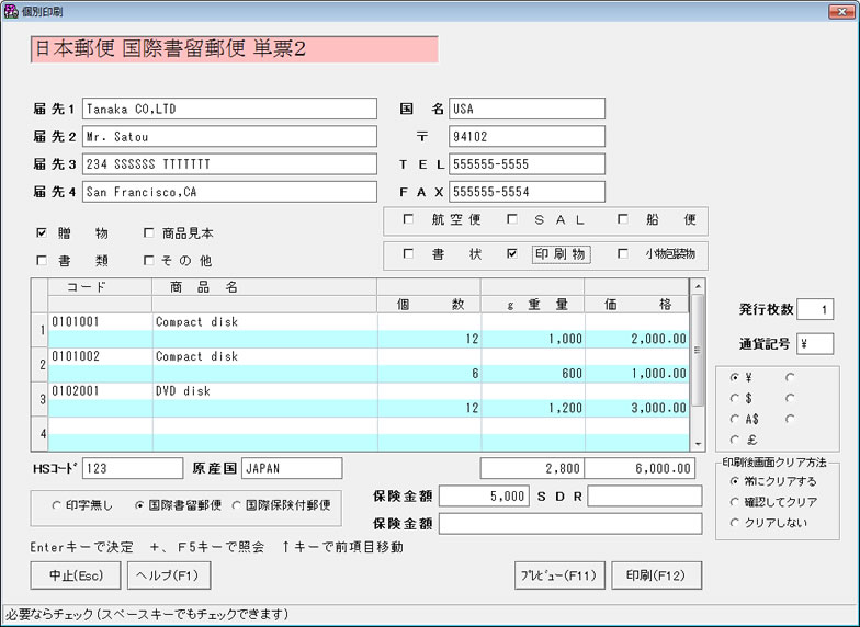 海外発送用送り状(EMS書類,物品,国際書留郵便,POSTAL PARCEL,FedEx,DHL)の印刷ソフト |